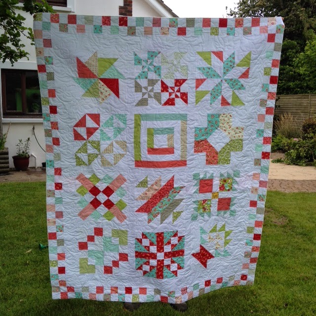 This is the Fat Quarter Shop BOM for 2014 called Wishes. Val has used Ruby by Bonnie & Camille for the most part. So fresh and I love the grass green essential dot that she used for the backing.
